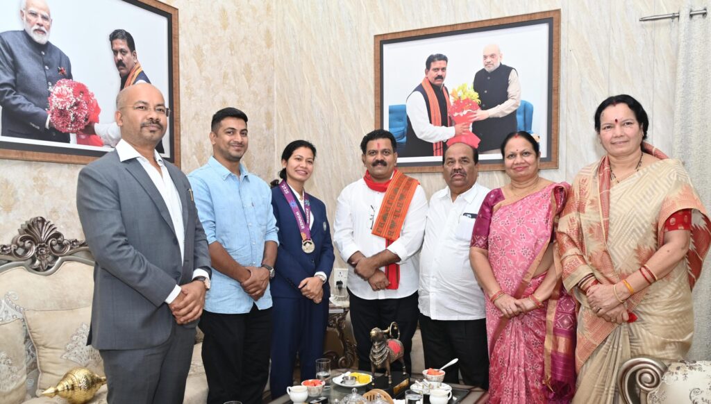 रायपुर : 11 नवम्बर 2025/ छत्तीसगढ़ के उपमुख्यमंत्री विजय शर्मा ने आज विश्व कप विजेता भारतीय महिला क्रिकेट टीम की फिजियोथेरेपिस्ट रहीं श्रीमती आकांक्षा सत्यवंशी एवं उनके परिजनों के साथ अपने निज निवास पर आत्मीय भेंट की और उन्हें बधाई एवं शुभकामनाएं दी। उपमुख्यमंत्री शर्मा ने उन्हें शौर्य के प्रतीक के रूप में गदा भी भेंट किया। जिसपर आकांक्षा ने हर्ष पूर्वक अपने विश्वकप के फाइनल मैच में गदा से जुड़ा एक वाक्या शेयर करते हुए बताया कि वे भी हनुमान जी की भक्त हैं और आखरी मैच में खिलाड़ी राधा यादव और क्रांति गौड़ पूरे समय हनुमान चालीसा का पाठ कर रहे थे। फिर जब उनकी मैच खेलने की पारी आयी तो उन्होंने एक छोटा सा गदा मेरे हांथों में देकर उसे मैच के अंत तक पकड़े रहने को कहा था और भगवान हनुमान की कृपा हम पर बनी रही और हम विश्व विजेता बन गए।